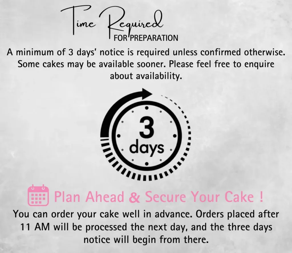 Our cakes must be stored in a refrigerator at a temperature below 5°C. Improper handling or storage may cause the buttercream to melt and the cake to lose its structure. For the best serving experience, remove the cake from the refrigerator approximately 30 to 50 minutes before serving, depending on the room temperature, to allow it to reach room temperature. Consume within 5 days of delivery.